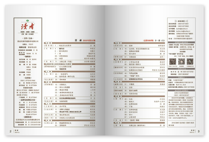 《讀者》創辦于1981年,半月刊,單期84頁,《讀者》是中國具有廣泛社會影響力的著名文化綜合類期刊,封面設計精美,排版簡約大方,內容傳遞出濃濃的人文關懷,深受國人喜愛。
