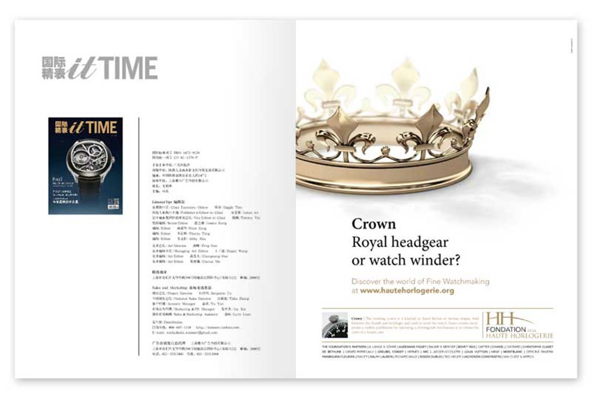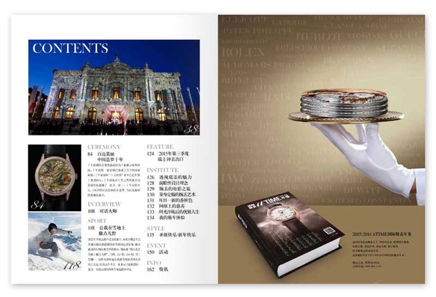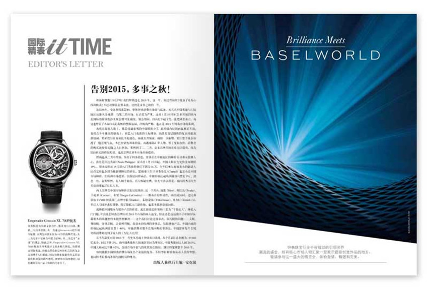 《國際精表itTIME》月刊,單期168頁,《國際精表》的編輯理念遵循“專業”、 “品味”、“實用”、“視覺”四個原則; 在腕表領域我們體現“專”業,在時尚領域我們體現“專”一;一切以腕表為核心展開選題。