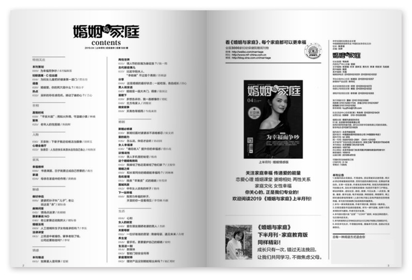 辦刊宗旨:密切關注并報道國內外婚姻家庭領域的新動向、新思潮、新問題,大力倡導科學、健康、文明的生活方式,解析和探討婚姻家庭領域的問題,傳播高尚的情操和科學的家教理念,是情侶的愛情解藥,是夫妻的心靈雞湯,是父母的貼身指南。