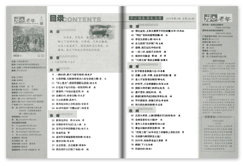 《開心·老年》主要欄目:生活、康壽、卷首、故事、情趣、在線等。