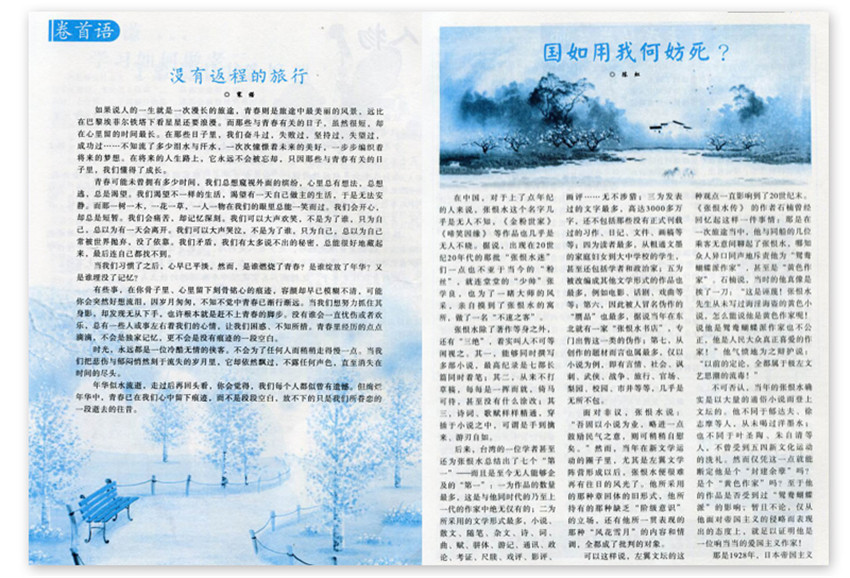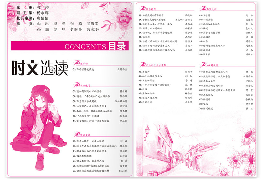 《時文選讀》主要欄目:心靈的觸動、有力的肩膀、七彩的人生、信仰的堅(jiān)守、歷史的星空、鄉(xiāng)愁的滋味、自然的啟示、人性的光輝、生活的波瀾、飛揚(yáng)的青春等。