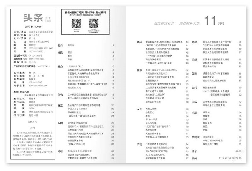 《鄉土·頭條》雜志每期從1萬余種書報刊中精選文章,對當前的熱點事件進行深度披露,對各類社會現象展開多角度探析,對新鮮觀點與爭鳴作系統介紹,對紛繁復雜的人生作哲理性思考。雜志內容涉及社會、人生、人物、文史、海外等各類經典文章,傳遞有關為人、立世、創業、發展的不朽價值,是你行走社會的生存讀本。