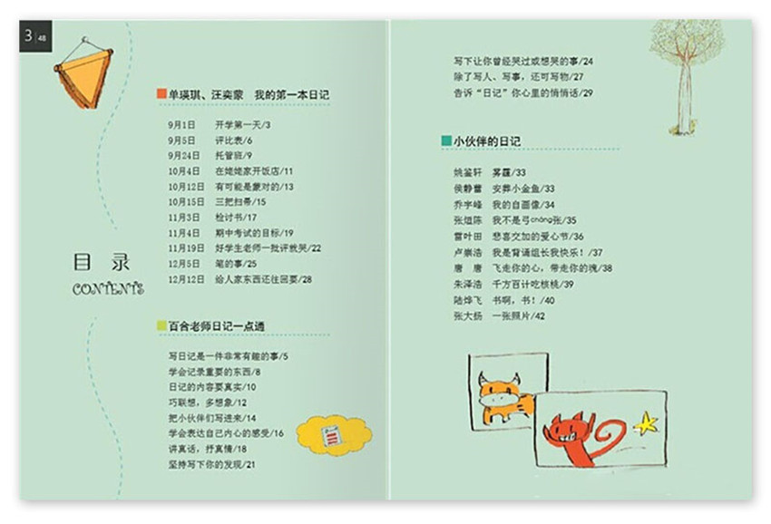 《我的第一本日記》主要欄目:開學第一天、開學典禮、評比表、沒事的包、托管班、找朋友等。
