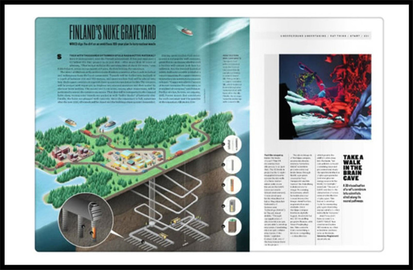 從欄目到設(shè)計,雜志力求恢復初的風格。同時,為了保持《連線》獨特的視覺特色,明亮的色彩、濃重的前衛(wèi)氣息依舊是《連線》意圖突出的氣質(zhì),但卻棄用了早年間常用的熒光效果,正文易與廣告混淆的問題得到了解決。花花綠綠的MTV風格的拼接版式也被改掉,用色更大膽,但也更專一,同時還顯得更具親和力,而非一派精英氣。