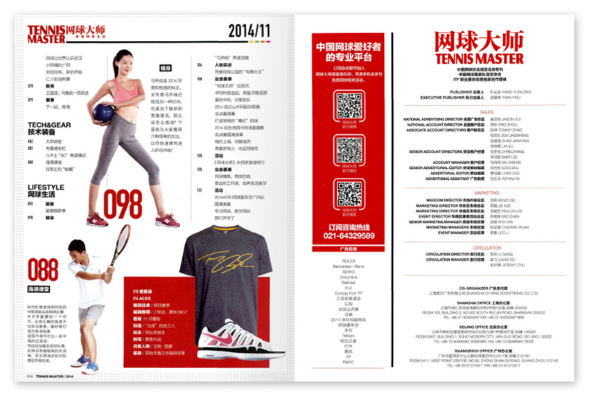 《體育博覽·網(wǎng)球大師》雜志以“大眾性、實用性、時尚性”為定位,緊貼中國實際,傳播中國大眾網(wǎng)球運動;以技術(shù)、裝備、網(wǎng)球俱樂部管理、網(wǎng)球?qū)I(yè)人才的供需溝通等服務(wù),提升雜志的實用價值;以高雅、現(xiàn)代的視覺表現(xiàn),豐富多元的內(nèi)容設(shè)置來傳播網(wǎng)球文化的時尚性,深度開發(fā)網(wǎng)球的高尚生活元素特性。