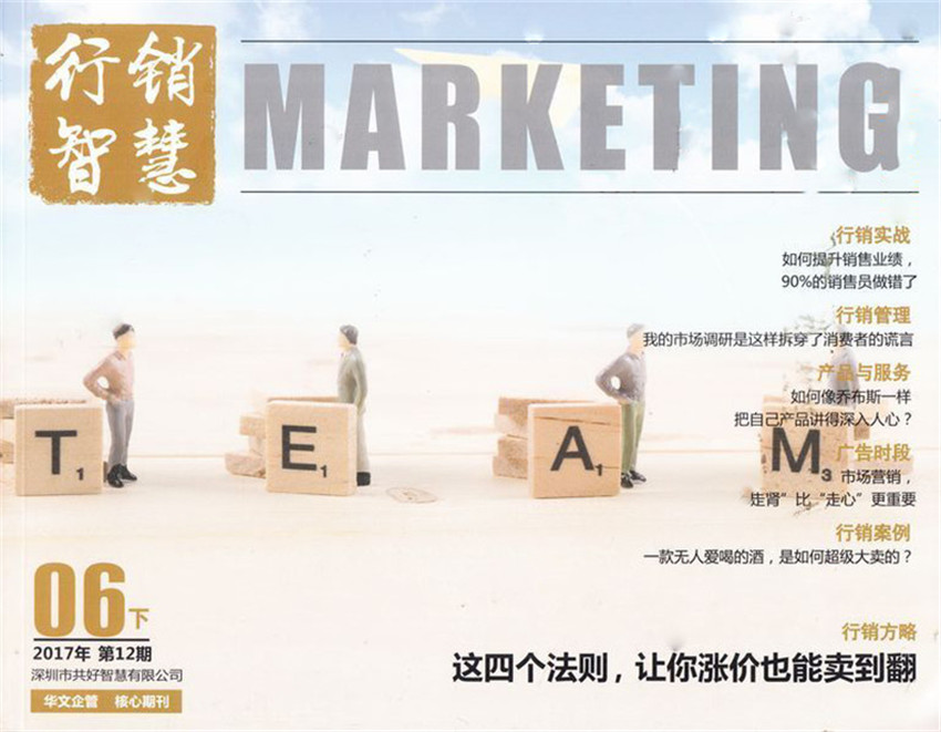 《行銷智慧》創辦于2009年,半月刊,單期90頁,《行銷智慧》雜志是國內價格高、不刊登廣告、完全憑精到實用的內容取勝的經管雜志,啟迪營銷智慧,創新行銷策略,協助您構建企業行銷的“策略、企劃、實戰方案、擴大影響力。