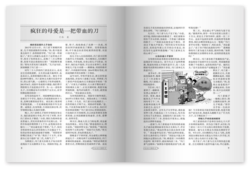 瘋狂的母愛是一把帶血的刀,編織謊言提升兒子自信,2013年12月11日,馮蘭素下班剛回到家,兒子劉晨就黯然告訴她:“媽,我不想讀重點高中了,你幫我轉學吧。”馮蘭素一聽就惱了:“多少人擠破頭也進不了這所重點中學,媽為了你四處求人,還繳了三萬元贊助費,你要不讀讓我情何以堪?”劉晨眼里涌淚:“我每天看見校門就想哭?!?