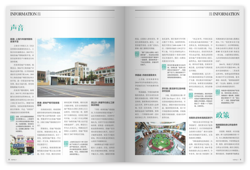 以性、受眾廣、影響大為特點,報道“公寓、別墅、商鋪”等多種物業(yè)資訊,解決“找房、選房、買房、租房”等各類實際問題,目前已成為上海地區(qū)發(fā)行量大、影響廣泛的房地產(chǎn)雜志。主要欄目:熱盤探營、熱盤鑒賞、熱盤推介、區(qū)域詳解等等。